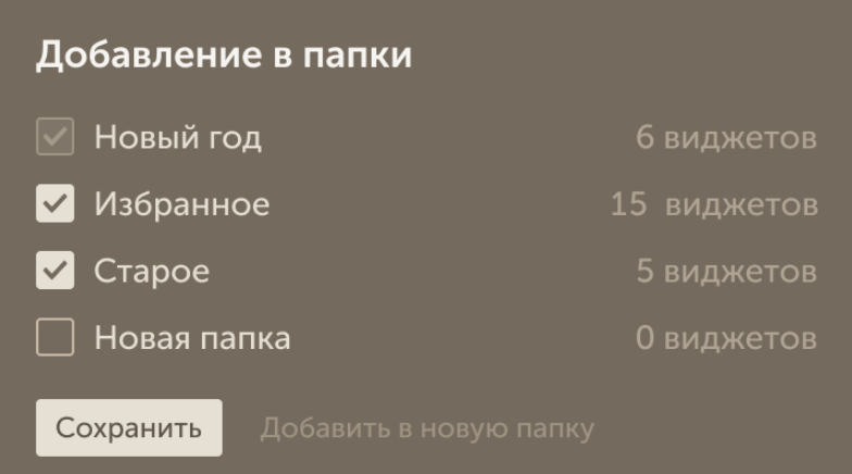 Если виджет уже находится в какой-либо папке, она будет отмечена автоматически, а чекбокс станет неактивным.