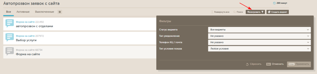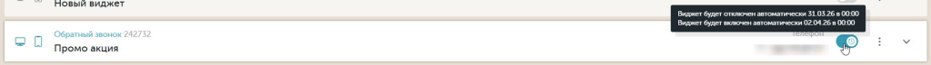 1. Статус виджета (доступен для виджетов: Автопрозвон заявок с сайта, Прозвон пропущенных, Кнопки соцсетей и мессенджеров, Интеграция Marquiz, Промо-ссылки, Проложить маршрут, Прямые вызовы, Сторонний чат)