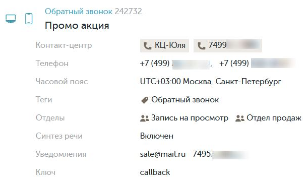 4. Телефон КЦ /почта (для виджетов: Автопрозвон заявок с сайта, Прозвон пропущенных, Интеграция Marquiz)