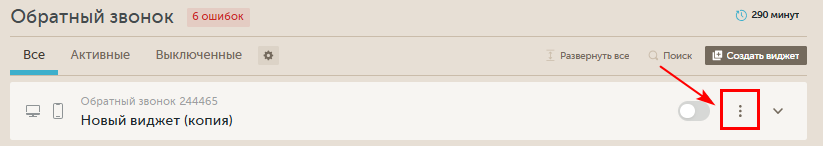 Чтобы клонировать уже существующий виджет полностью со всеми его настройками, наведите на него мышкой и кликнете на появившуюся кнопку. Новый виджет появится в конце списка уже существующих, его название будет содержать название оригинала и пометку (копия). При этом копия будет неактивной. -