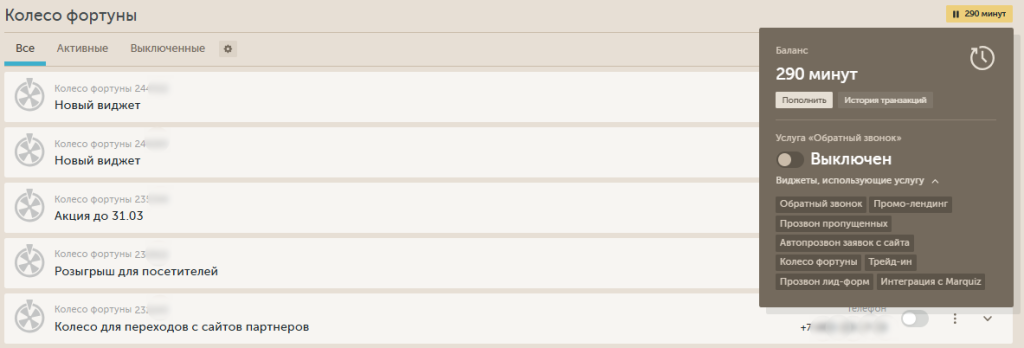 При переходе в любой раздел внутри блока «Конверсии» (например, «Обратный звонок» или «Колесо фортуны») система отображает список уже созданных виджетов этого типа, если они есть.