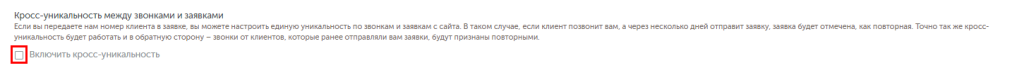 Включение данной опции затронет проверку звонков и заявок на уникальность. В этом случае при поступлении нового звонка, его уникальность будет определяться не только поиском среди ранее зафиксированных звонков с этого же номера, но и поиском среди ранее зафиксированных заявок, в которых был указан этот же номер. В результате, если с этого номера ранее был совершен другой звонок или оставлена заявка – звонок будет повторный. В ином случае, если с этого номера не было совершено ранее звонков и не оставлялись заявки — звонок будет уникальный.