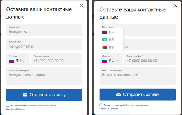 Если выбрано нескольких стран, на форме у блока телефон появится выпадающий список с буквенным кодом и флагом страны. При посещении сайта страна пользователя будет определяться автоматически по его IP-адресу.