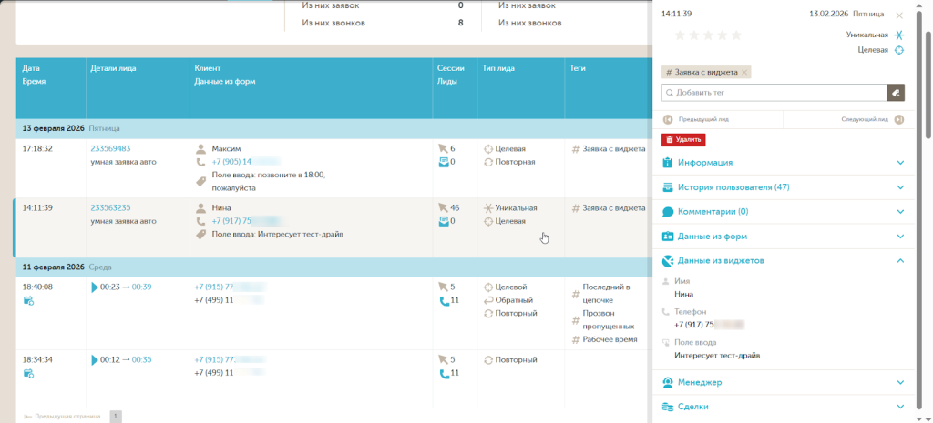 Все полученные через виджет заявки отображаются в журнале заявок и лидов.