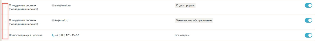 Рассылки можно перетаскивать между собой и устанавливать в любом порядке. Для перемещения рассылки необходимо зажать данную область и потянуть: