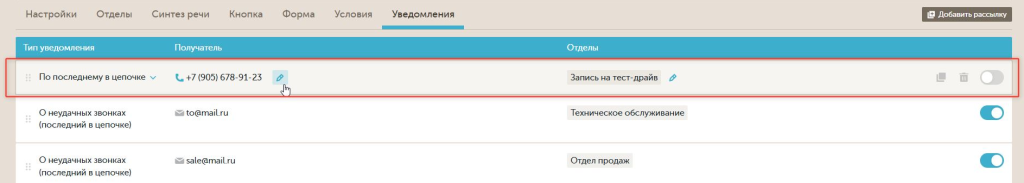 Если выбрать тип уведомлений "О неудачных звонках", то уведомление отправится по неудачному звонку, если он последний в цепочке.