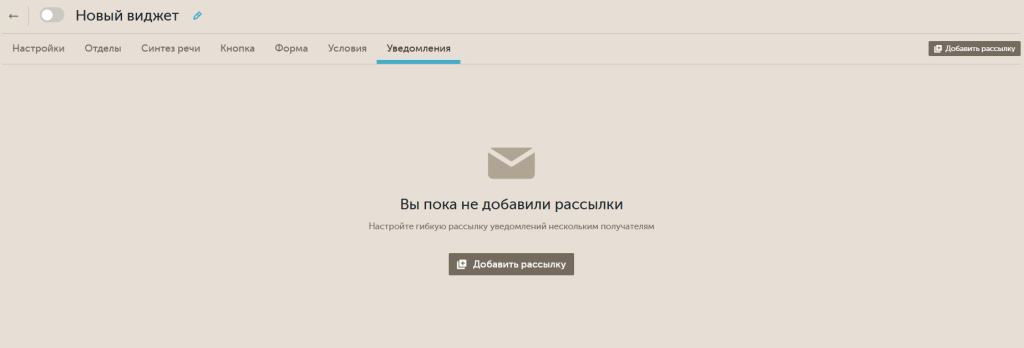 При первом переходе в раздел "Уведомления", где еще не настроено ни одной рассылки, будет отображаться заглушка с предложением добавить рассылку уведомлений.