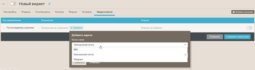 Получателей можно добавить при клике на кнопку "Добавить". После этого, откроется окно с выпадающим списком, где необходимо выбрать канал связи.