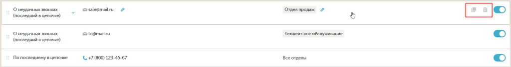 При наведении на плашку с рассылкой появляются иконки копирования и удаления: