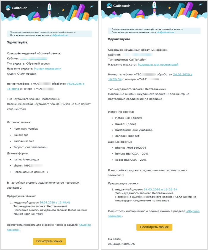 Уведомления будут поступать после завершения обратного звонка или последней попытки дозвона и появлении его в статистике личного кабинета Calltouch. Уведомления по E-mail будут поступать с адреса callback@calltouch.net, а по СМС - с номера "Calltouch".