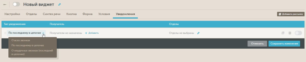 Если выбрать тип уведомлений "По последнему в цепочке", то по цепочке звонков (при условии настройки повторных звонков) будет отправлено только одно письмо — либо по первому удачному звонку, либо по последнему в цепочке.