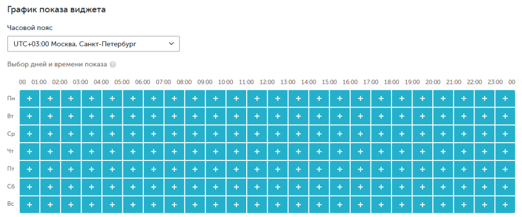 Вам необходимо выбрать часовой пояс и настроить расписание показов виджета на сайте. График показа виджета может отличаться от графика работы контакт-центра.