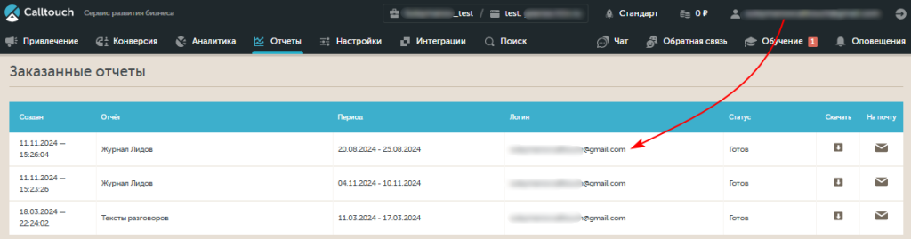 Заказанные отчеты по аккаунту
