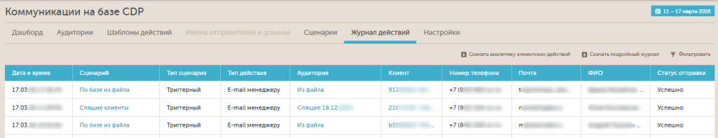 На вкладке «Журнал действий» отображается история коммуникаций по действиям пользователей. Здесь вы сможете увидеть: