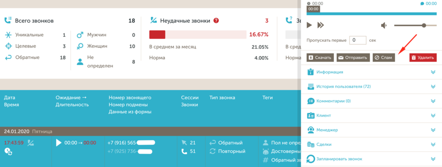 При клике на кнопку звонок помечается как спам и появляется меню, в котором можно выбрать, в какой черный список добавить (подмена и/или обратный звонок).